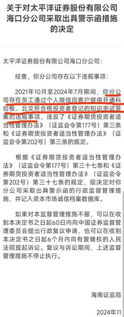 12月9日,海南证监局披露了一则罚单,太平洋证券海口分公司因员工通过个人微信向客户提供开通科创板、北交所合格投资者登记的知识测试答案,被采取出具警示函的监管措施。这一行为违反了相关规定,也暴露了券商在投资者适当性管理方面的漏洞。