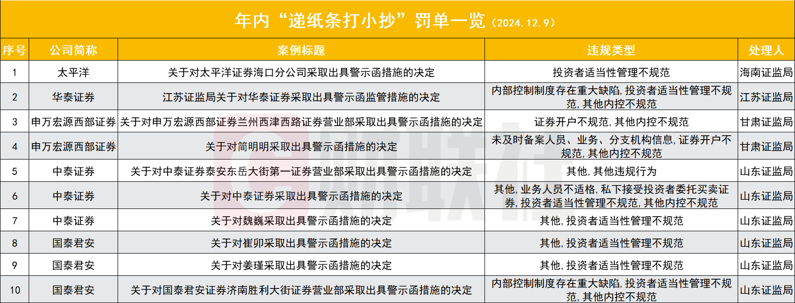 年内,因“递纸条打小抄”而遭罚的案例不在少数。易董数据统计显示,截至12月9日,已有5家券商因此类违规行为被罚,包括太平洋证券、华泰证券、申万宏源、西部证券和中泰证券。这些券商均因员工向客户提供测试答案而违反了投资者适当性管理的相关规定。