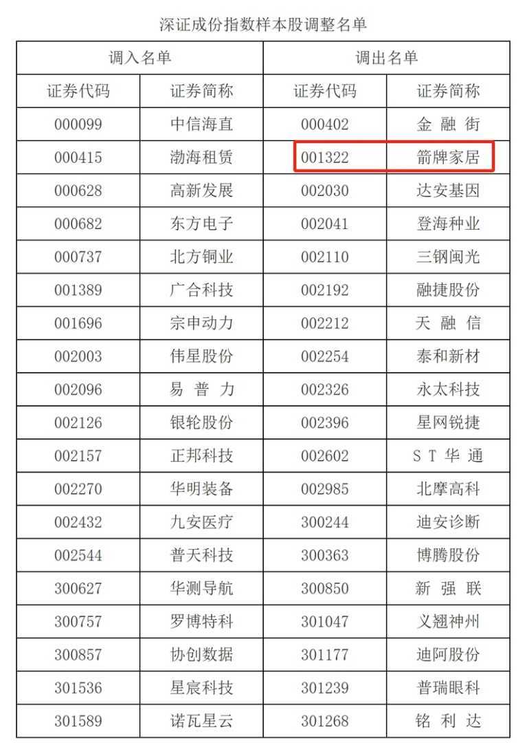 同时,深交所也发布了关于深证成指、创业板指、深证100等指数样本股的定期调整公告。根据公告,深圳证券交易所和深圳证券信息有限公司将于2024年12月16日对上述指数实施样本股调整。在深证成份指数样本股调整名单中,箭牌家居被调出;而在深证100指数样本股调整名单中,东方雨虹则位列其中。