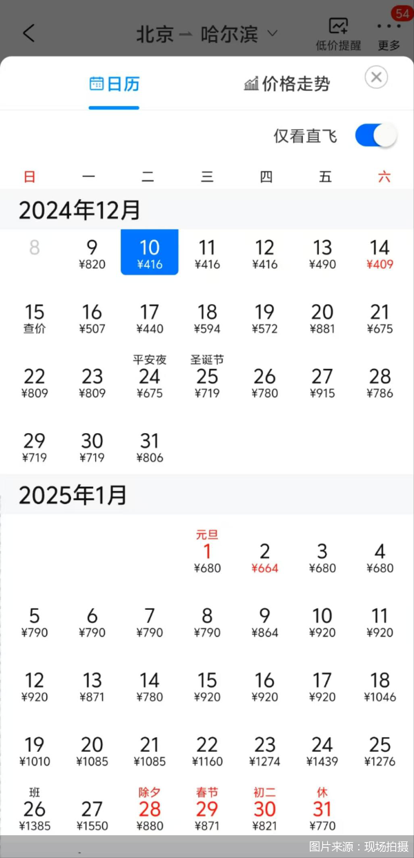 随着冰雪游的持续升温,哈尔滨的机票价格也出现了明显上涨。本周内(12月9日—15日),北京至哈尔滨的去程直飞机票最低价基本维持在500元以下,但从12月16日开始,最低价明显上涨,部分日期甚至达到809元。而春节前夕,机票价格更是飙升至1550元。