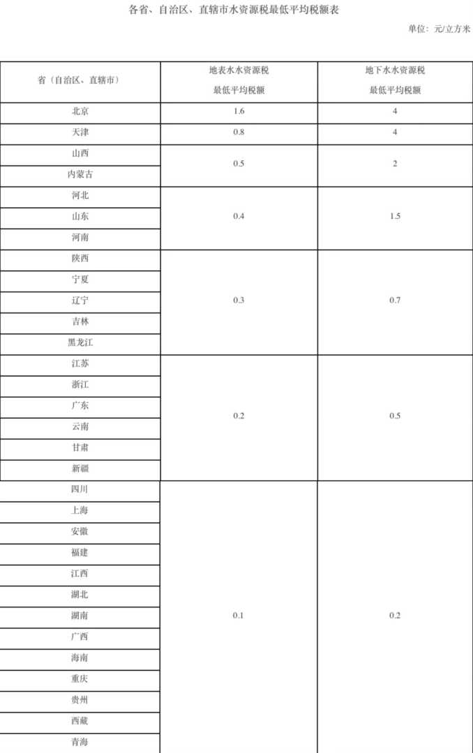 (图源:《水资源税改革试点实施办法》)展示了各省份地表水水资源税最低平均税额的差异。