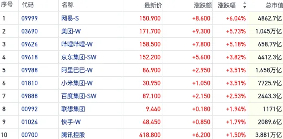盘面上,科技龙头股、大金融板块及中字头权重股携手拉升。科技股中,网易涨幅接近6%,美团上涨超5%,京东涨幅接近4%,小米、阿里巴巴均涨超3%,百度、快手、腾讯亦均录得上涨。