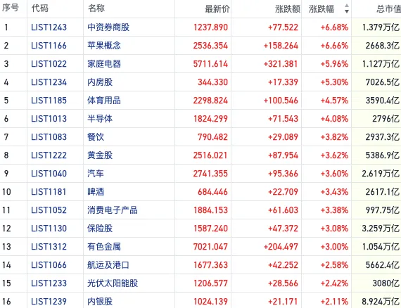 此外,券商股在大金融板块中领跑,招商证券大涨13.65%,保险股紧随其后。内房股亦显著上扬,苹果概念股、航空股、生物医药及半导体板块均呈现上涨态势。