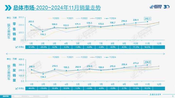 11月,国内车市延续了“金九银十”的销售热潮,市场表现持续强劲。12月9日,乘联会公布的最新数据显示,11月全国乘用车市场零售量达到242.3万辆,同比增长16.5%,环比增长7.1%。