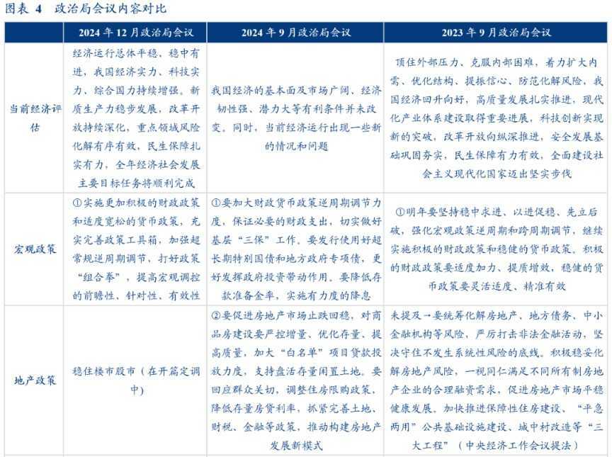 短期内,受益于政策表态和货币政策的宽松预期,股市与债市均将受益。中期资产配置与行业导向则需等待两会明确赤字率与财政空间,以及经济数据的进一步验证。附录部分提供了政治局会议内容的详细对比,为读者提供了更多背景信息。