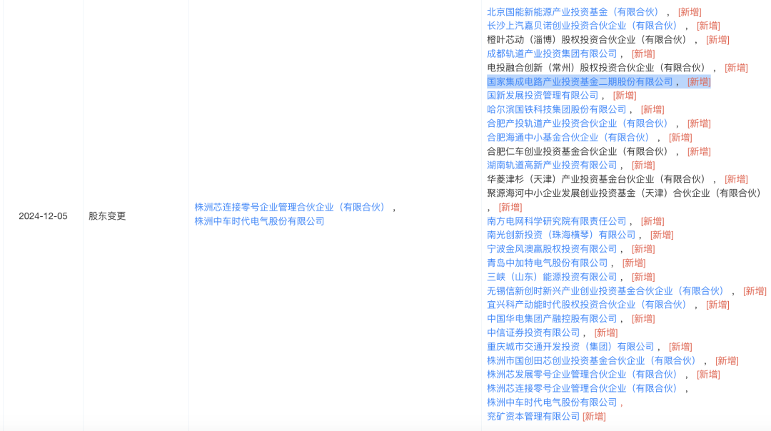 工商登记显示,12月5日,时代半导体完成股东变更,新增大基金二期等战略投资者。此次增资扩股中,大基金二期增资3亿元,持股1.3256%,成为时代半导体的前六大股东之一。