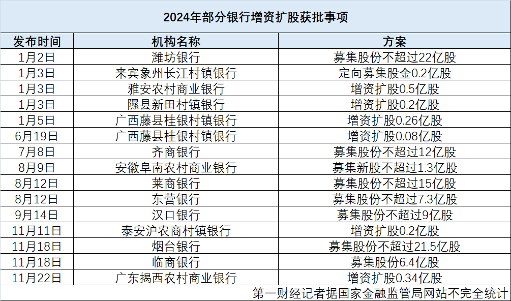 与大型银行发债相比,中小银行则更倾向于通过增资扩股或定向募股的方式来补充资本。据金融监管总局披露的数据不完全统计,今年以来已有超过70家中小银行的增资扩股或定向募股方案获得了监管批复,这一数量明显高于往年。