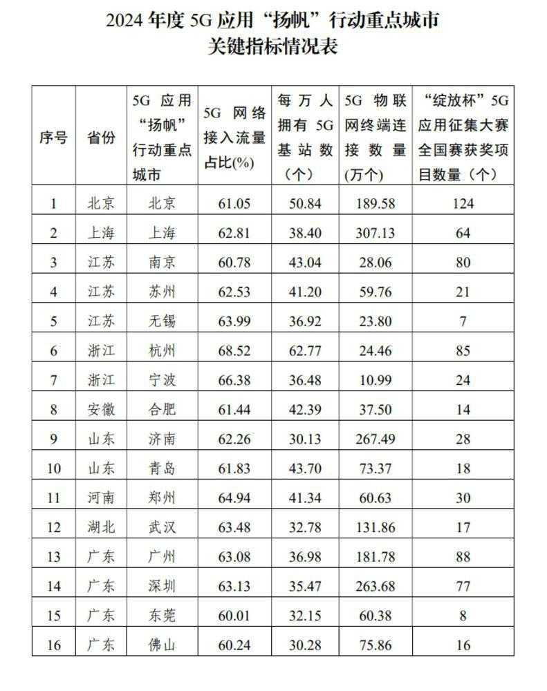 工信部发布2024年度5G应用“扬帆”行动重点城市评估报告,16个城市在流量提升、连接规模、应用创新等方面取得突破。其中,广东的广州、深圳等城市表现尤为突出,涌现出许多好的工作经验和做法。
