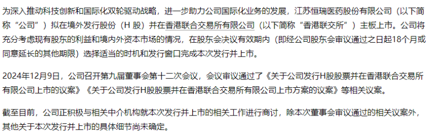 12月9日,江苏恒瑞医药股份有限公司发布公告,宣布其董事会已审议通过一项重大决策,计划在香港联交所主板发行H股并上市,旨在进一步推动公司的国际化业务发展。