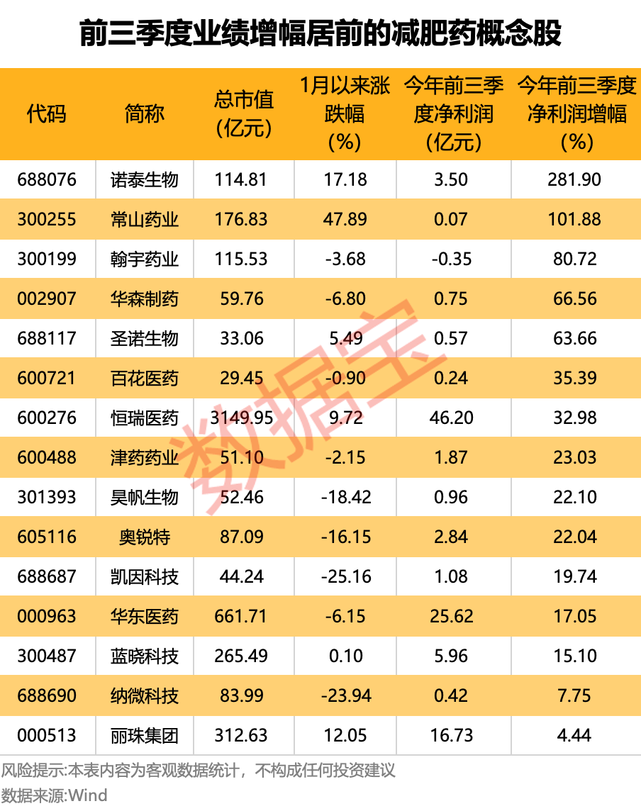 A股市场减肥药概念股共25只,其中诺泰生物作为多肽类原料药领军企业,供应GLP-1类减肥原料,前三季度扣非归母净利润同比增长301%。