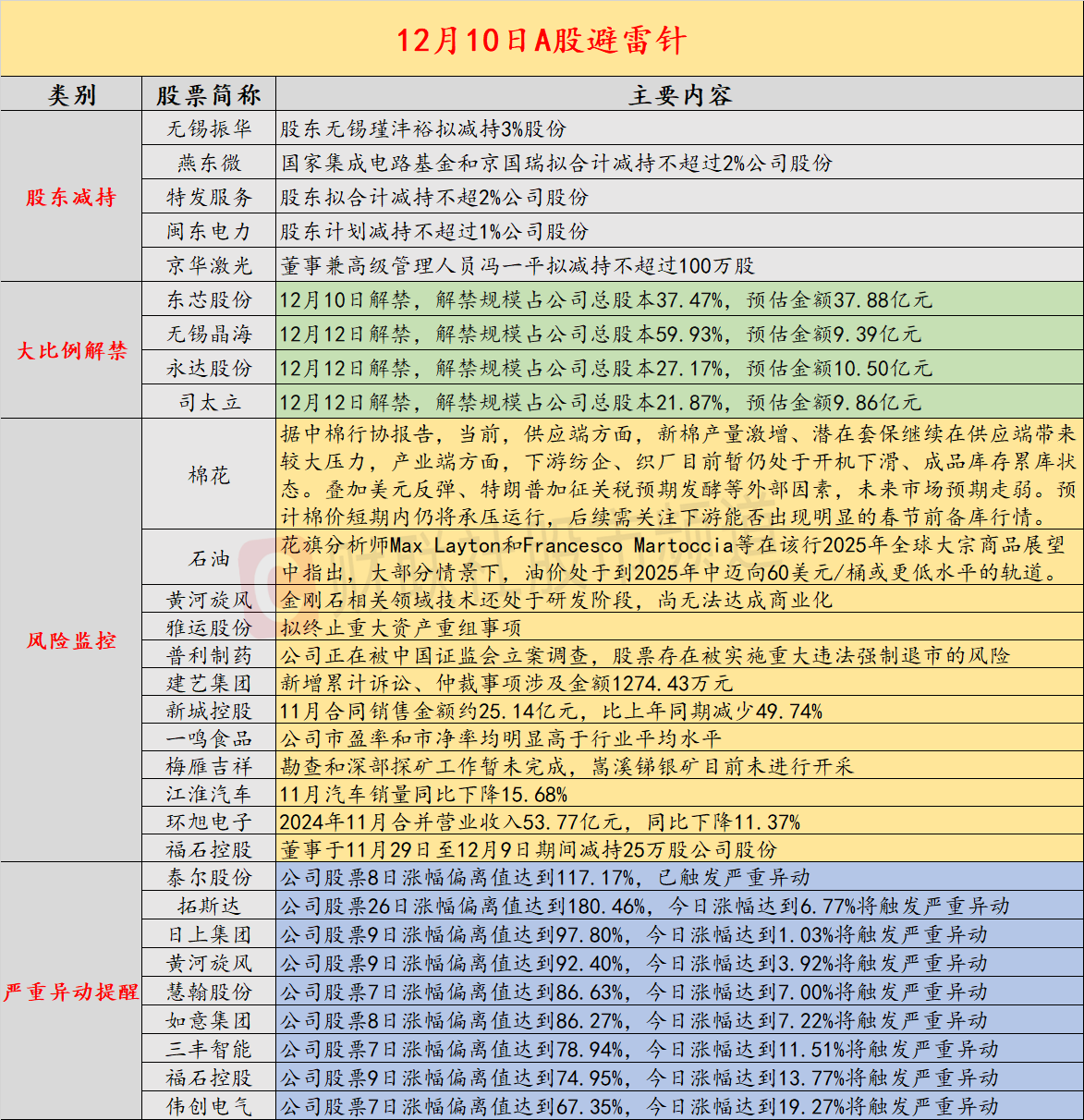 导读:财联社12月10日发布投资避雷针,概述近期A股及海外市场潜在风险。国内经济方面,中棉行协预警棉价承压;国产电池级碳酸锂价格连续下滑。公司动态中,黄河旋风金刚石技术未达商业化;雅运股份终止重大资产重组。海外市场方面,美股收跌,加密货币概念股走低;英伟达因涉嫌反垄断被立案调查。