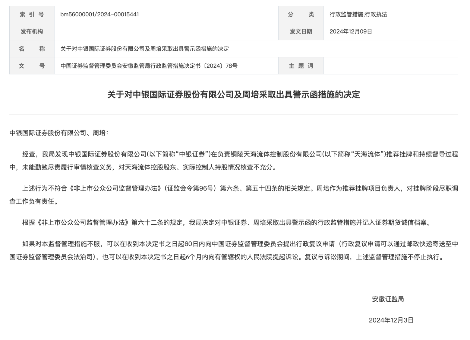 安徽证监局对中银证券及项目负责人开出罚单,因其在企业挂牌期间未履行审慎核查义务。天海流体因新三板挂牌时未如实披露实控人股份代持行为受到公开谴责。中银证券在推荐挂牌和持续督导过程中存在疏忽。
