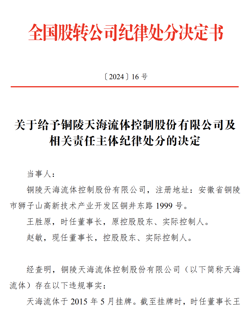 据企查查显示,天海流体于2015年5月挂牌,中银证券为其主办券商。而在此之前,天海流体已因在新三板挂牌时未如实披露实控人股份代持行为而受到公开谴责。全国股转公司于今年4月29日对天海流体作出处罚,指出其在挂牌时存在股份代持,未如实披露公司控股股东、实际控制人及公司历史沿革。