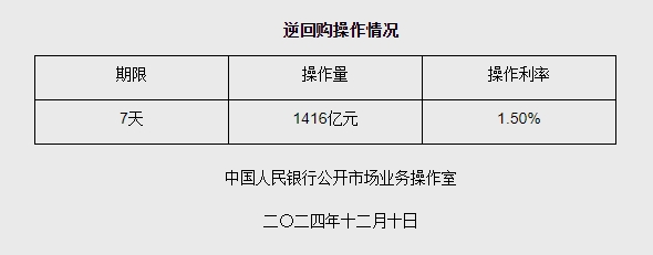 人民银行为保持银行体系流动性合理充裕,于2024年12月10日以固定利率、数量招标方式开展了1416亿元逆回购操作,此举有助于维护金融市场稳定,促进经济平稳健康发展。