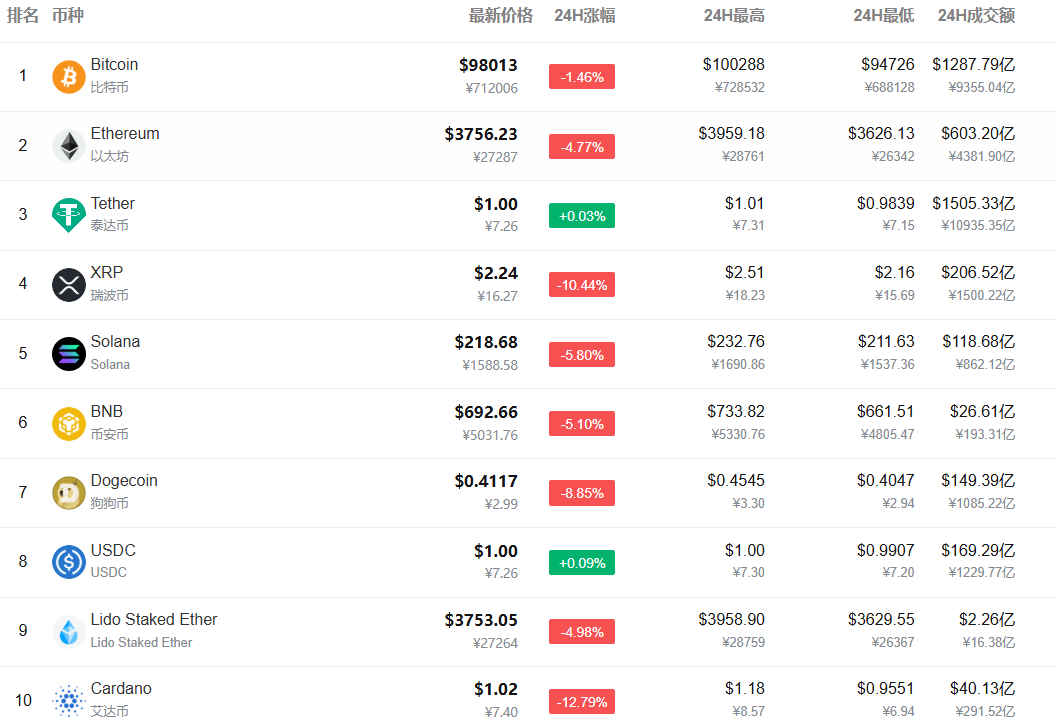 比特币价格在凌晨5时左右迅速下探至94000美元,随后有所回升,目前稳定在97600美元上方。此外,以太坊等其他主流加密货币也普遍走低,其中以太坊日内跌幅达到4.77%,狗狗币、艾达币、币安币等同样出现下跌。