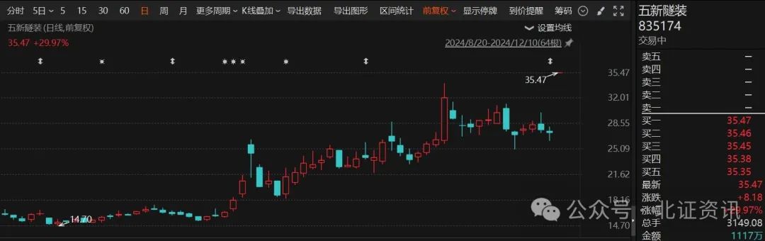 在公布重大资产重组方案并短暂停牌后,北交所上市公司五新隧装今日恢复交易,并以“一”字涨停开盘,股价达到35.47元,创出历史新高。这一表现,无疑为市场注入了一剂强心针。