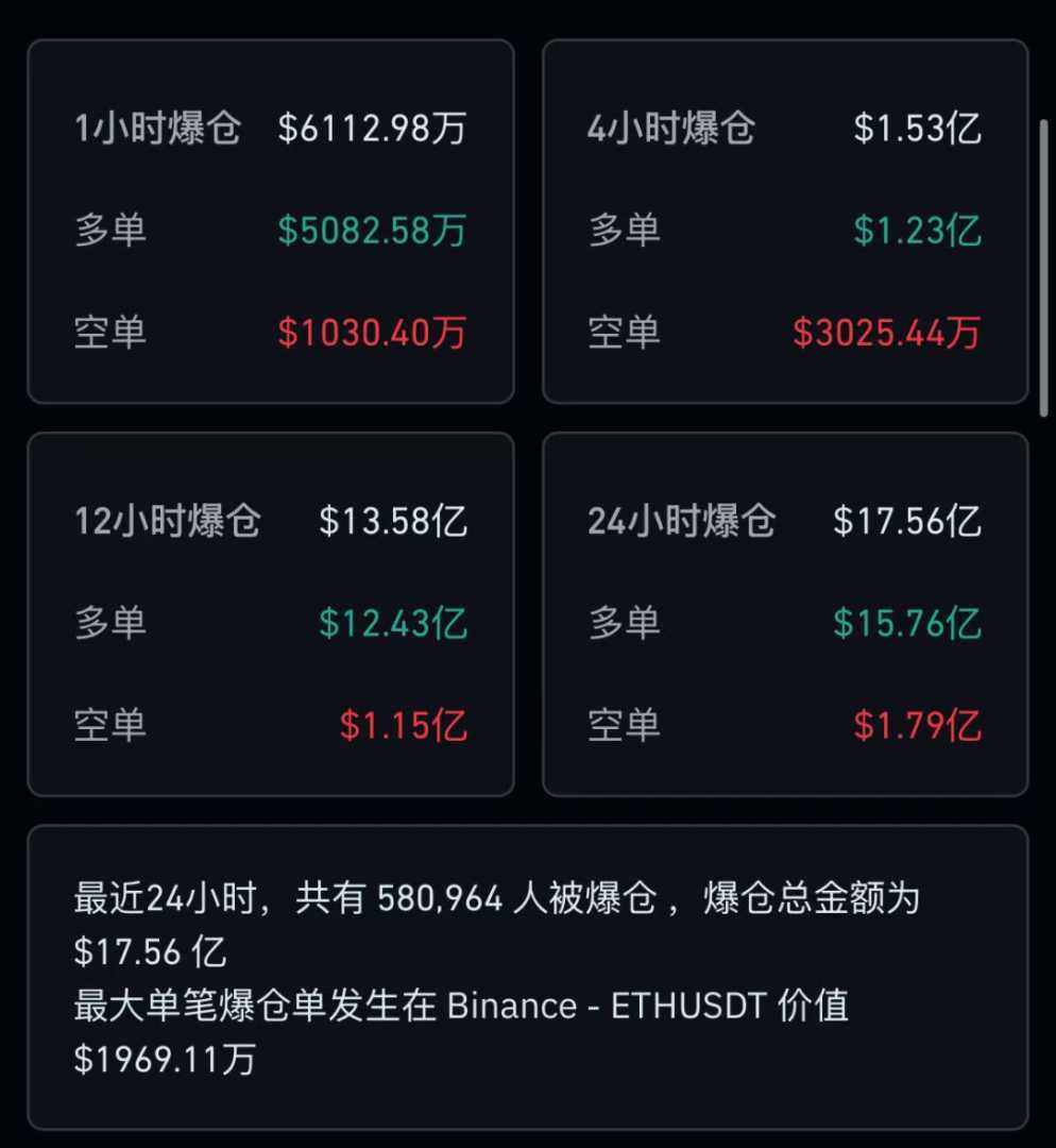此次比特币的短时暴跌,对部分投机者造成了严重打击,导致大面积亏损。据CoinGlass最新数据显示,过去24小时内,虚拟货币市场中超过58万名投资者遭遇爆仓,总金额高达17.56亿美元(折合人民币约127亿元),市场恐慌情绪蔓延。