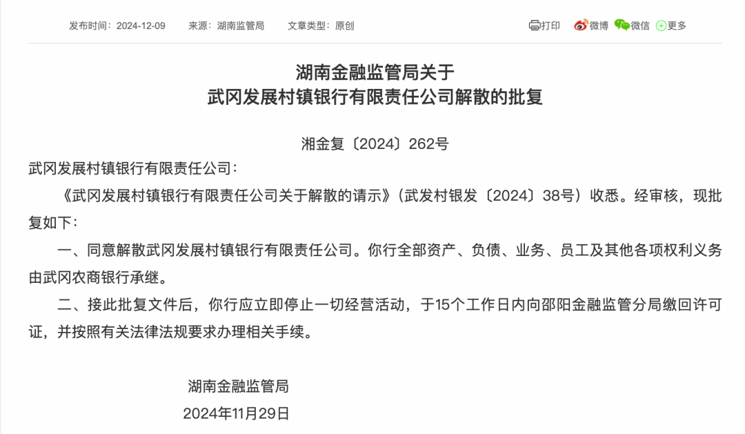 同样在11月29日,武冈发展村镇银行也获批解散,其全部资产、负债、业务、员工及其他各项权利义务将由武冈农商银行承继。武冈农商银行于9月30日获准吸收合并武冈发展村镇银行。