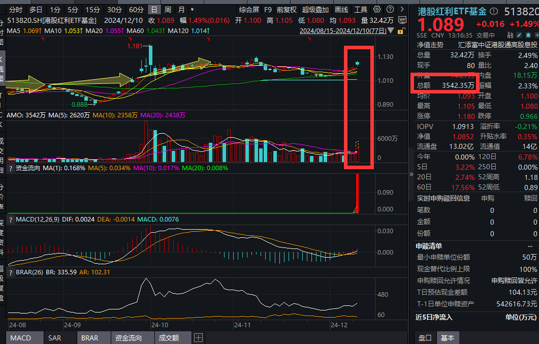 热门ETF方面,港股红利ETF基金(513820)巨幅放量大涨1.49%,冲击三连涨,盘中成交额超3500万元,创近15日新高,交投显著活跃。该基金最新规模为14.13亿元,稳居同指数ETF第一。其标的指数(港股通高股息指数)12月9日的股息率高达7.03%,领衔全市场主流红利指数。