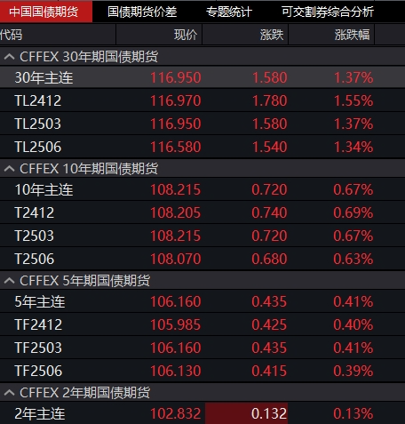 国债期货市场午后表现强劲,各期限主力合约纷纷上扬。截至收盘,30年期主力合约涨幅达到1.37%,10年期主力合约上涨0.67%,5年期主力合约上涨0.41%,2年期主力合约上涨0.13%,均创下收盘价历史新高。