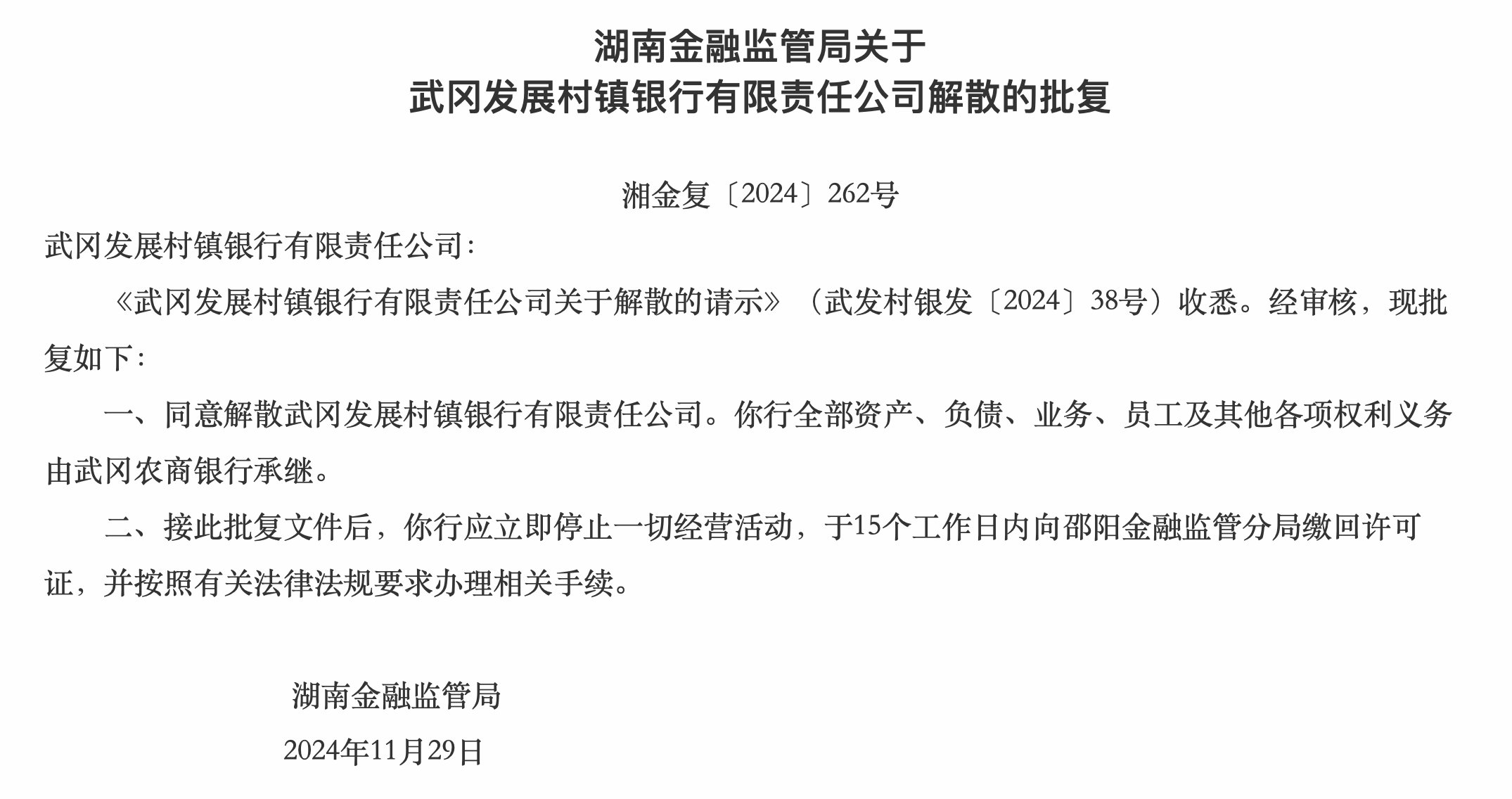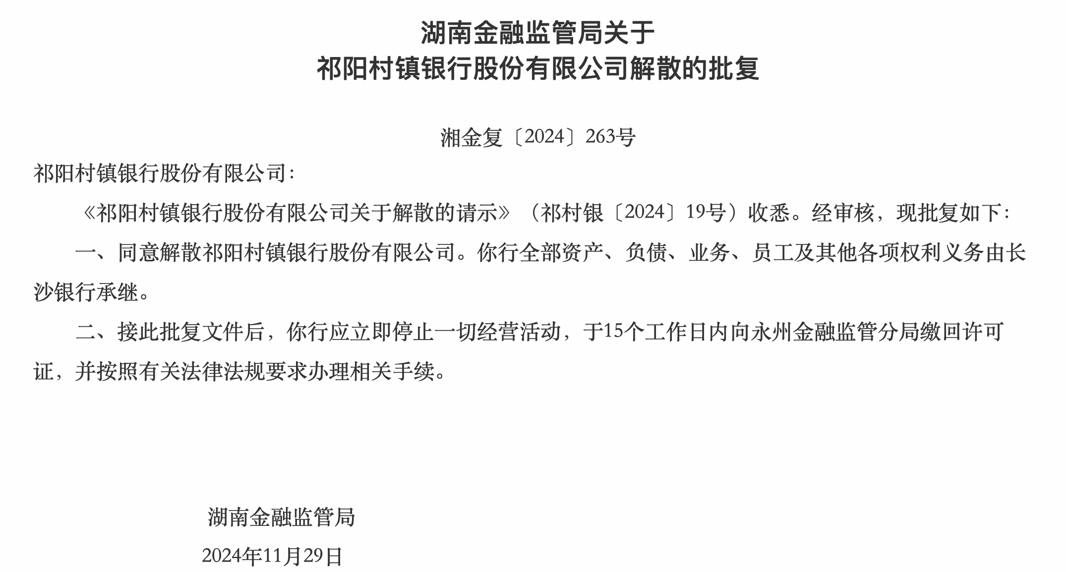 12月9日,国家金融监督管理总局湖南金融监管局行政许可信息显示,武冈发展村镇银行和祁阳村镇银行均获批解散,其资产、负债、业务等将由武冈农商银行和长沙银行分别承继。