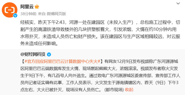 针对此事件,阿里云于12月10日通过其官方微博发布声明进行澄清。声明中提到,经核实,事故发生在昨天下午2:43,地点为河源一处尚处于在建阶段的园区(该园区尚未投入生产)。在总承包商的施工过程中,切割作业产生的高温铁渣意外引燃了楼外的几块挤塑板,导致浓烟滚滚。幸运的是,火势在大约10分钟内就被迅速赶到的消防人员用水带扑灭,没有造成任何人员伤亡或财产损失。同时,阿里云强调,该在建园区与生产区域相隔甚远,因此此次事件对阿里云的云服务未造成任何影响。