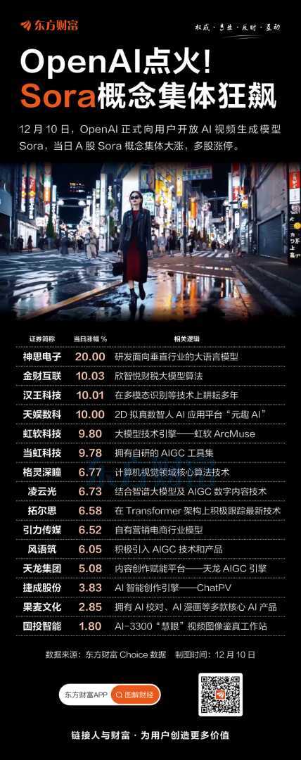 Sora的火爆不仅限于科技界,也引发了A股市场的强烈反响。当日,与Sora相关的概念股集体飙升。其中,神思电子、金财互联、汉王科技等股票强势涨停,虹软科技、当虹科技涨幅超过9%,格灵深瞳、凌云光、拓尔思等股票的涨幅也均超过6%。这一市场表现充分展示了投资者对Sora及其潜在商业价值的看好。