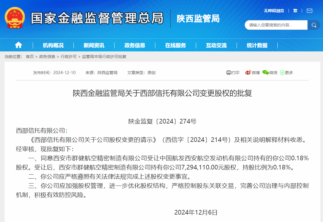据国家金融监督管理总局网站消息,陕西金融监管局已正式批复,西安市群健航空精密制造有限公司成功受让中国航发西安航空发动机有限公司所持有的西部信托0.18%股权。此次受让完成后,西安市群健航空精密制造有限公司将持有西部信托7,294,110.00元股权,占总股本的0.18%。