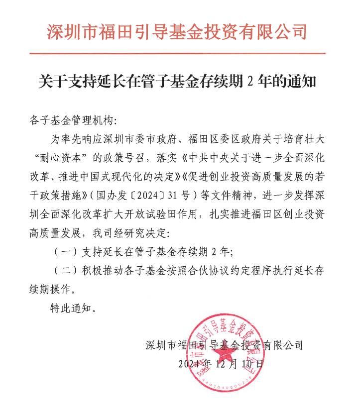 12月10日,中国基金报记者从深圳市福田引导基金投资有限公司(以下简称“福田引导基金”)处了解到,该公司向其旗下所有子基金管理机构发布了《关于支持延长在管子基金存续期2年的通知》,率先在全国范围内批量无差别地延长存量子基金的存续期,期限为2年。