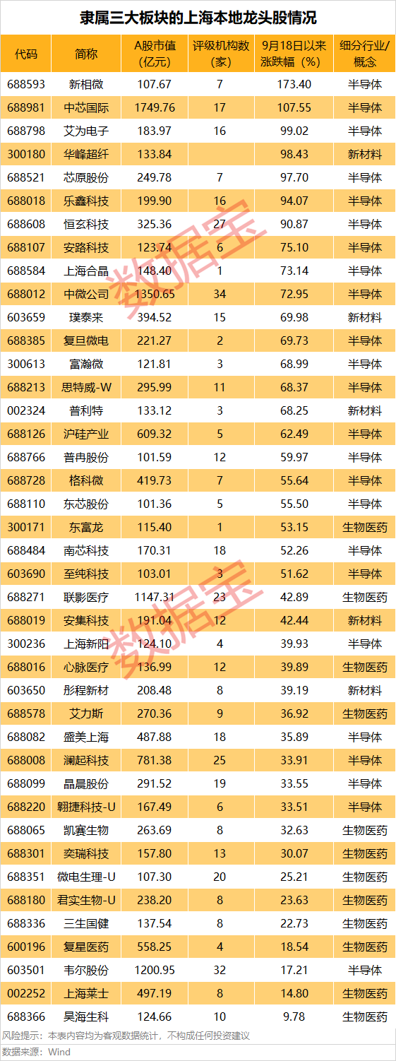 此外,根据行动方案提及的重点产业领域,上海本地的半导体、医药、新材料等行业的龙头企业,同样有望受益于并购方案。据统计,不包含央企、国企在内,上述三个板块中市值超过百亿元的上海本地股合计有41只,其中中芯国际A股市值超过1700亿元,居首位。中微公司、韦尔股份、联影医疗等个股市值也均超千亿元,受到机构的高度关注。