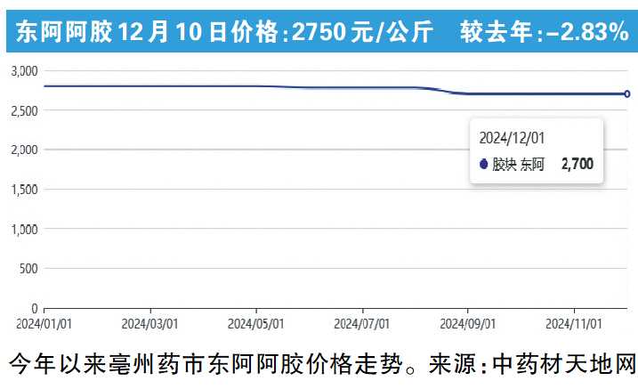 冬季滋补正当时,滋补品市场迎来销售旺季,其中阿胶备受瞩目。中药材天地网数据显示,近期阿胶价格保持稳定,12月10日市场东阿阿胶价格为2750元/公斤。然而,记者走访广州多家药店发现,阿胶销售景气度一般,昔日“免费熬胶”服务的火热场景已不复存在。