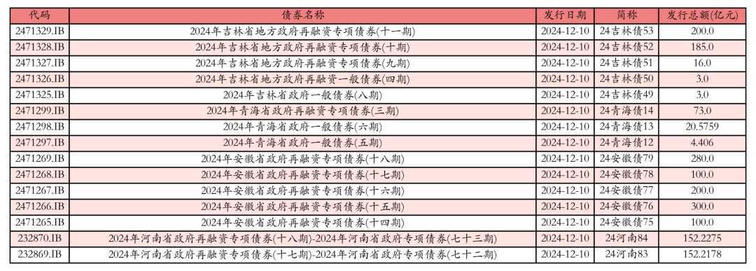 2024年12月10日,全国共发行15支地方政府债,总金额1789.4272亿元。其中吉林、安徽、河南、青海发行规模靠前,各债券中标倍数及利率情况一并公布。