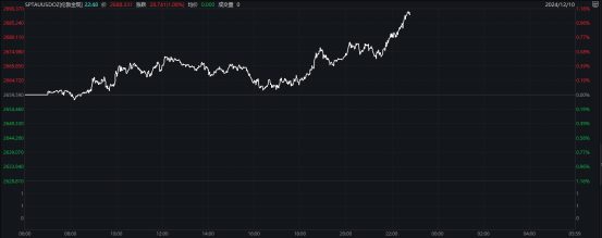 晚间交易时段,现货黄金价格继续攀升,触及2690美元/盎司,为近段时间以来的新高。截至发稿时,黄金价格涨幅约为1.1%,连续三日呈现上涨态势。