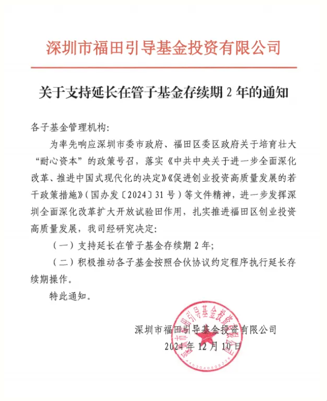 深圳市福田引导基金投资有限公司发布通知,支持延长在管子基金存续期2年,并推动各子基金按合伙协议执行延长操作,累计参与投资子基金51只,规模合计约1604.47亿元。