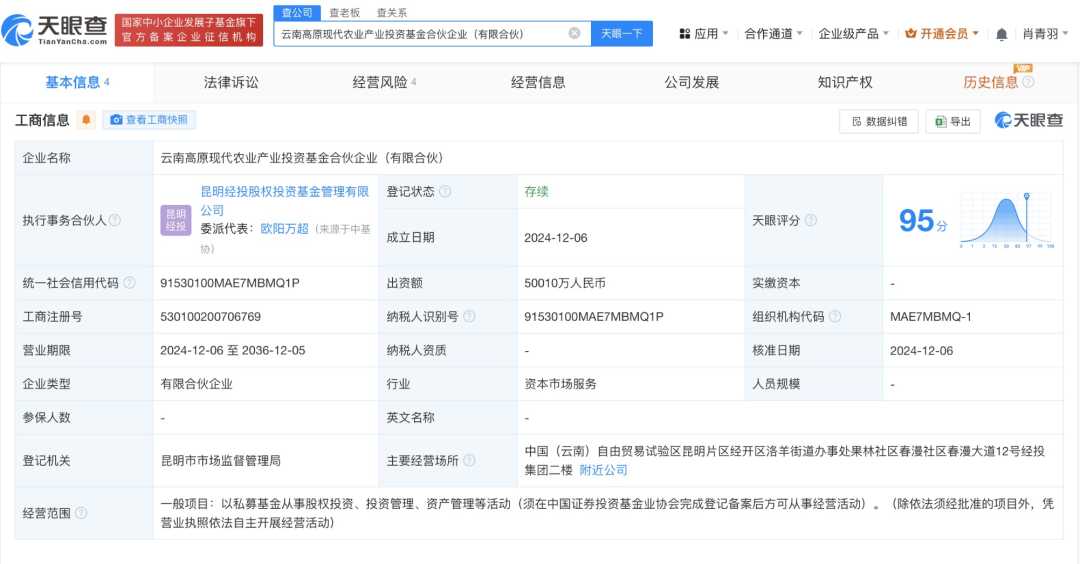 南方财经12月10日电,据天眼查App最新数据显示,近日,一家名为云南高原现代农业产业投资基金合伙企业(有限合伙)的新基金正式成立。该基金的执行事务合伙人确定为昆明经投股权投资基金管理有限公司,其出资规模达到了约5亿元人民币。该基金的主要经营范围涵盖了以私募基金形式参与的股权投资、投资管理以及资产管理等多项活动。
