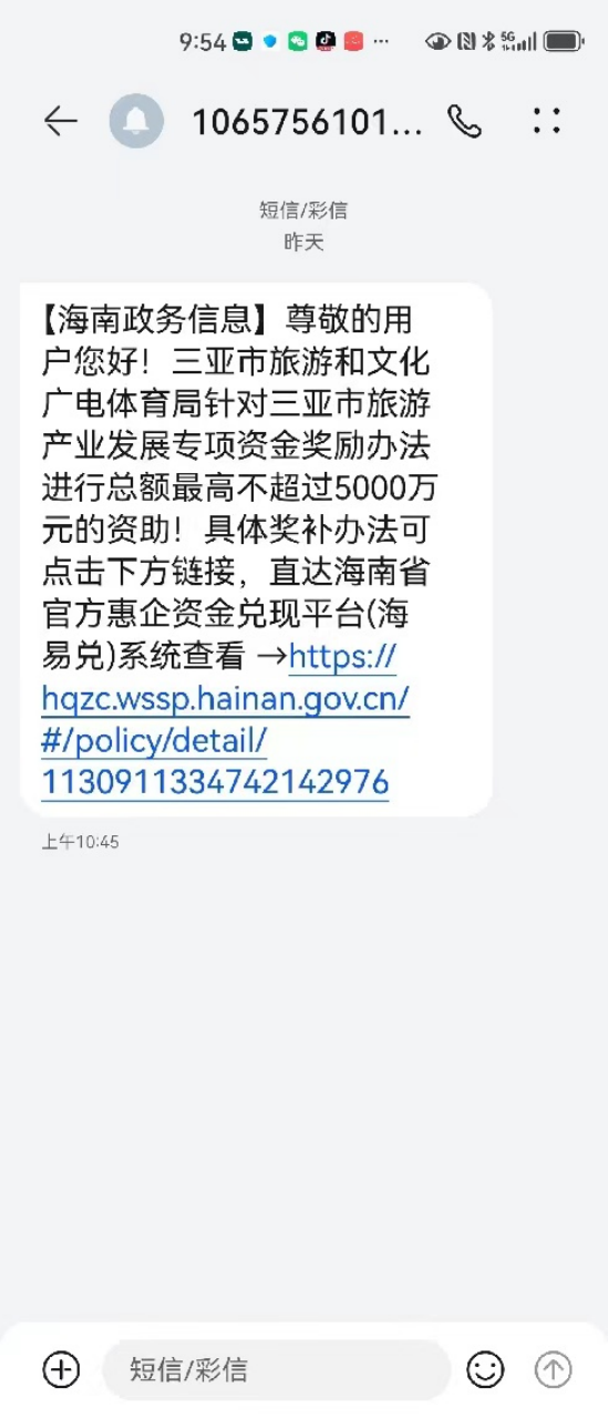 截至目前,“海易兑”平台已上线三亚市级163个惠企政策文件,涉及23个部门的180项惠企政策兑现事项,已完成兑付5.55亿元,资金兑付金额等指标在海南省各市县中名列前茅。精准推送的政策短信切实助力了企业发展,进一步稳固了企业的发展信心。