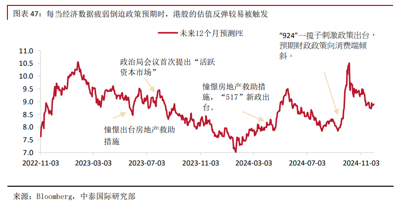 图注:每当经济数据疲弱倒迫政策预期时,港股的估值反弹较易被触发