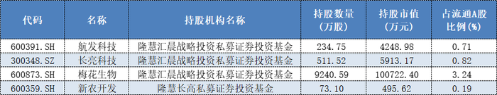 Wind数据显示,截至三季报,隆慧投资旗下产品合计持仓总市值为11.14亿元,其中仅梅花生物单只个股的持仓市值便高达10.07亿元。此外,隆慧投资还持有航发科技、长亮科技和新农开发等多家公司的股份。