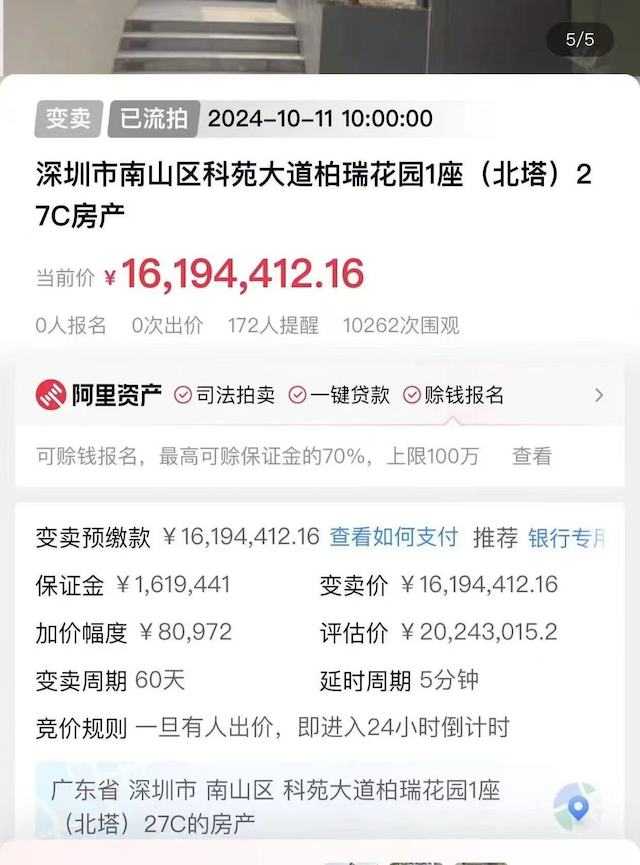据深圳市官方通报,着火楼层包括27、28、29以及30楼。目前,事故原因仍在进一步调查中。值得注意的是,燃烧范围内的一套房产在今年多次被挂牌法拍,但均因无人出价而流拍。该房产位于柏瑞花园1座(北塔)27C,起拍价从最初的2024万元降至1619万元,因借款合同纠纷被法院查封。