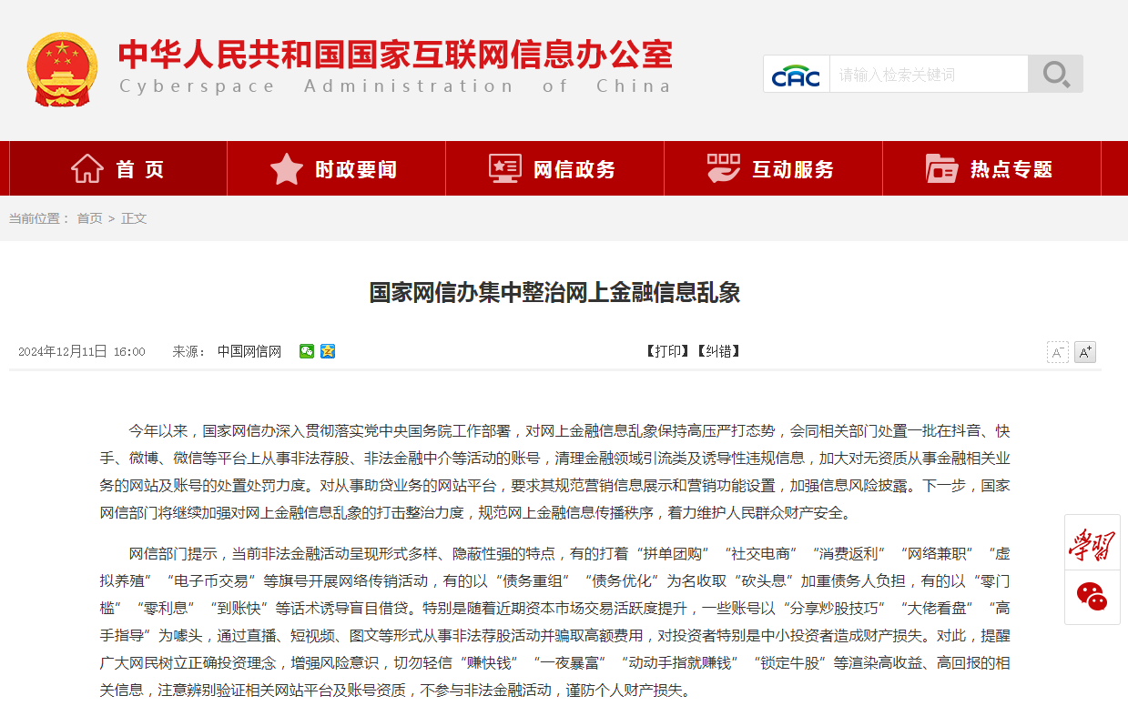 今年以来,国家网信办积极响应党中央国务院的号召,对网上金融信息乱象展开了持续的高压打击行动。该部门联合相关部门,在抖音、快手、微博、微信等社交平台,查处了一批从事非法荐股、非法金融中介等活动的账号,有效清理了金融领域的违规引流信息及诱导性内容。同时,国家网信办还加大了对无资质从事金融相关业务的网站及账号的处罚力度,维护了网络金融信息的秩序。