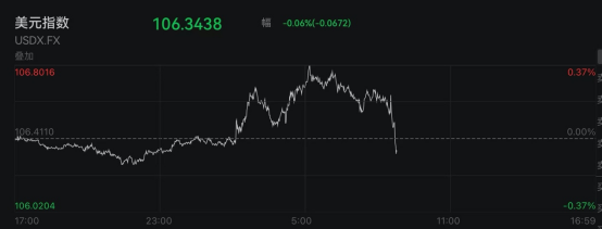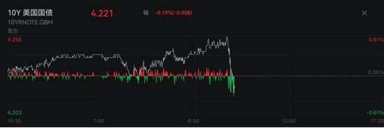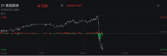 市场反应方面,黄金、白银并无明显波动,而美元指数则短线跳水,抹去日内所有涨幅。美国国债收益率也震荡走低,其中10年期国债收益率报4.221%,2年期国债收益率的回落尤为明显,报4.126%。
