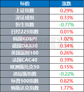 欧洲股市方面,三大股指均小幅上涨。其中,德国DAX指数收盘上涨0.34%,报20399.16点;法国CAC40指数收盘上涨0.39%,报7423.40点;英国富时100指数收盘上涨0.26%,报8301.62点。