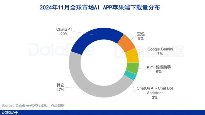 根据DataEye数据显示,11月全球市场豆包app在苹果端的下载量排名全球第二,国内第一,显示出豆包应用的强劲市场表现。