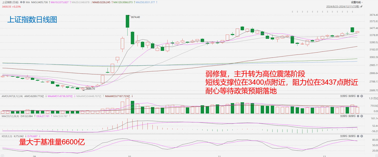 昨日指数呈现弱修复态势,而短线投机情绪则表现出强修复特征。当前指数已从主升阶段转入高位震荡阶段,建议投资者耐心等待中央经济工作会议的结果,以决定后续的投资方向。