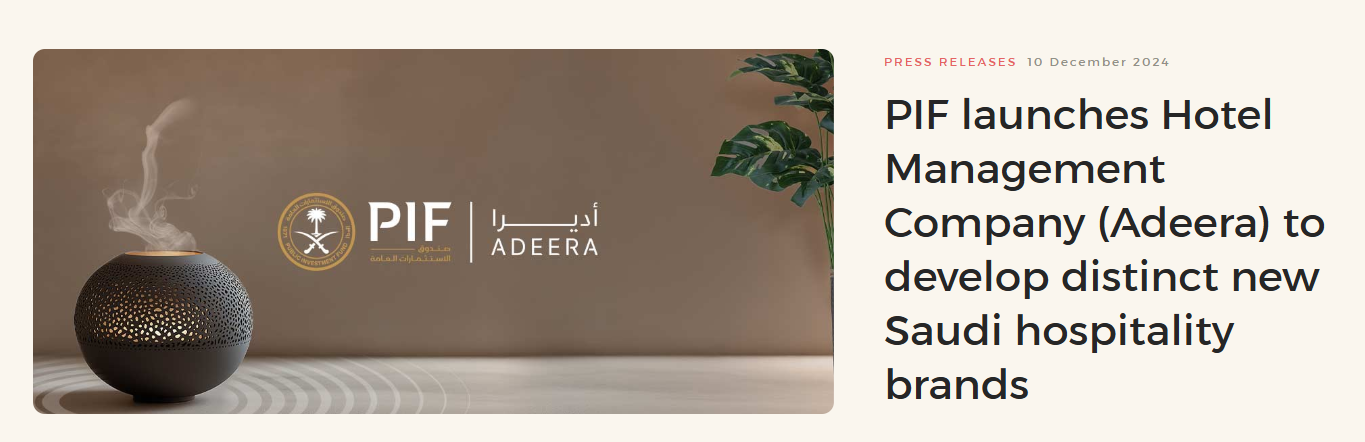 沙特主权基金——公共投资基金(PIF)近期宣布成立全资子公司Adeera,专注于发展本土多元化的酒店品牌。Adeera的成立旨在满足不同游客群体的需求,从中端住宿到超豪华体验一应俱全。