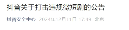 12月11日傍晚,抖音安全中心再次发布《抖音关于打击违规微短剧的公告》,展示了平台在维护健康内容生态上的坚定立场。