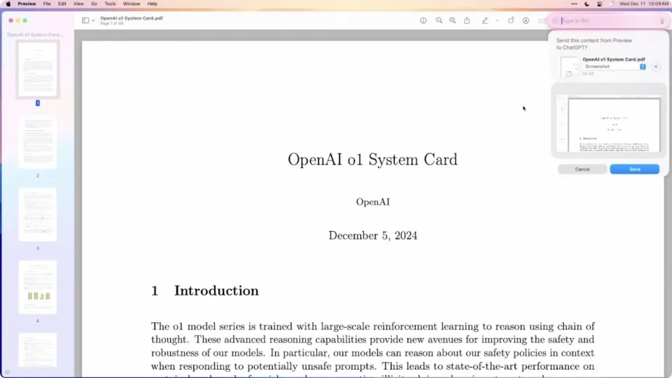 OpenAI技术直播第五日的焦点并非AI新品,而是其与苹果的深度合作。OpenAI宣布,ChatGPT已全面融入苹果生态,覆盖iPhone、iPad及Mac等设备,凡支持Apple Intelligence的苹果产品均可启用ChatGPT功能。