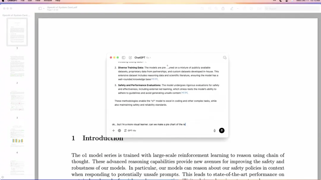 演示中,OpenAI团队在苹果笔记本上利用ChatGPT解读了一份49页的o1模型技术报告。ChatGPT精准识别并阐述了报告中的编码技术及其应用场景,同时展示了强大的数据可视化能力,根据需求生成饼图。