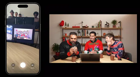 在“圣诞毛衣大赛”演示中,ChatGPT展现了其视觉智能能力。长按iPhone相机控制按钮,ChatGPT即可实时分析画面内容,识别毛衣特征,并以幽默方式为节日装扮打分排名,最终宣布Sam Altman的毛衣最具“趣味性”。