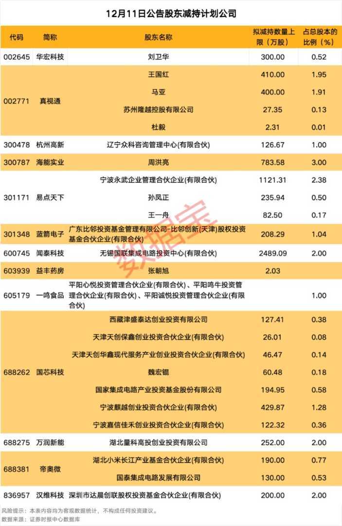 12月11日,市场传来消息,共计13家公司相继公布了其股东的减持计划。从市场表现来看,截至午间收盘,真视通股价下跌超过4%,易点天下则低开低走,跌幅更是达到了8%以上,而国芯科技同样下跌超过5%。然而,值得注意的是,此前连续涨停的一鸣食品,其股价在当日依然维持了强势表现。